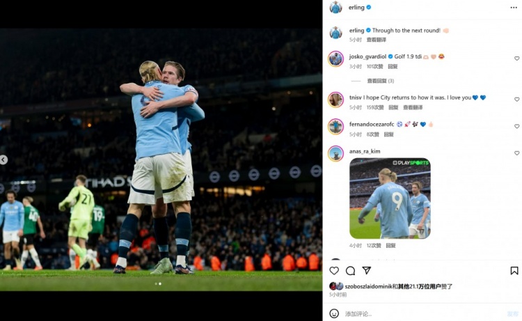 2025-03-02 16:12:43布丁連線再現,哈蘭德社媒曬與德布勞內擁抱合影:晉級下一輪!