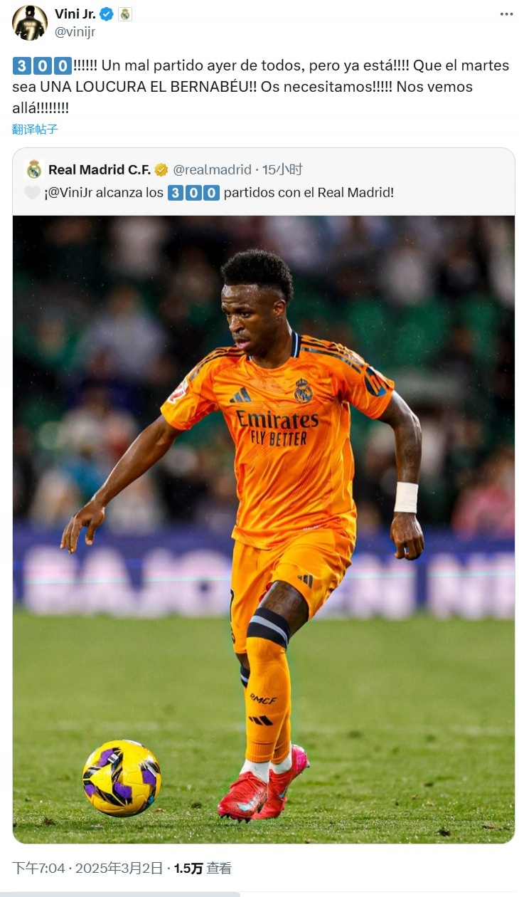 2025-03-02 21:44:41維尼修斯社媒:300場里程碑!一場糟糕的失利,但下周二還有大戰