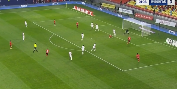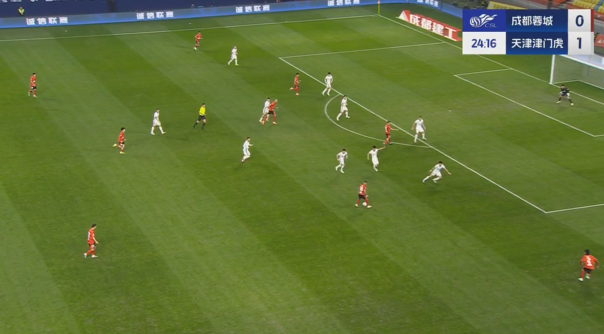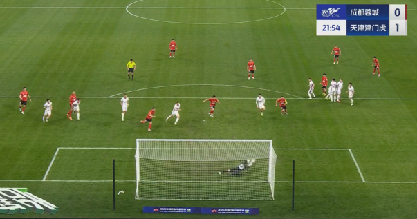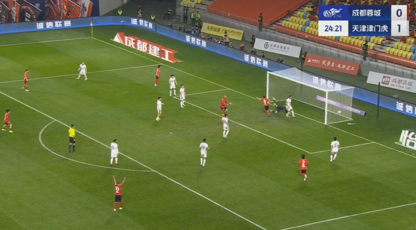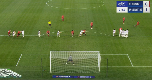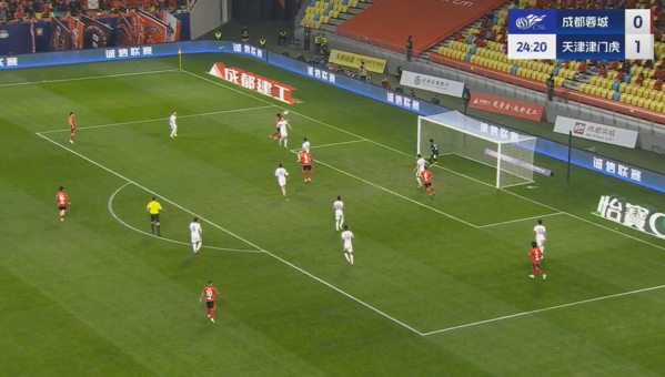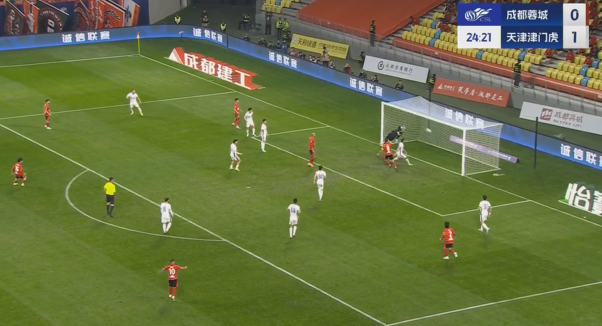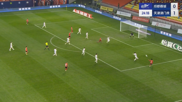 第25分鐘,蓉城扳平比分,胡荷韜右路送出精準傳中,韋世豪頭球吊射頂入球門遠角,蓉城1-1津門虎。