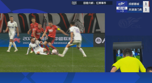 上半場補時階段,周定洋搶球時踩到哈達斯,視頻助理裁判介入,主裁判查看回放后向周定洋出示紅牌。