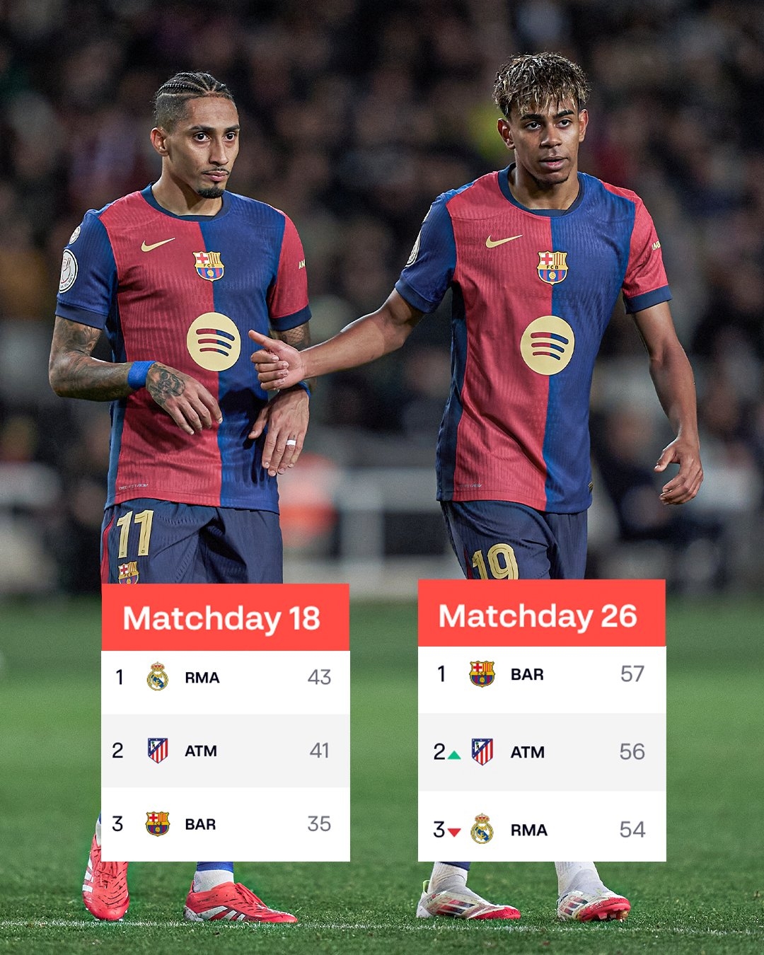 2025-03-03 16:10:12扭轉局勢!ESPN曬照:18輪后巴薩落后皇馬8分,第26輪后巴薩領跑