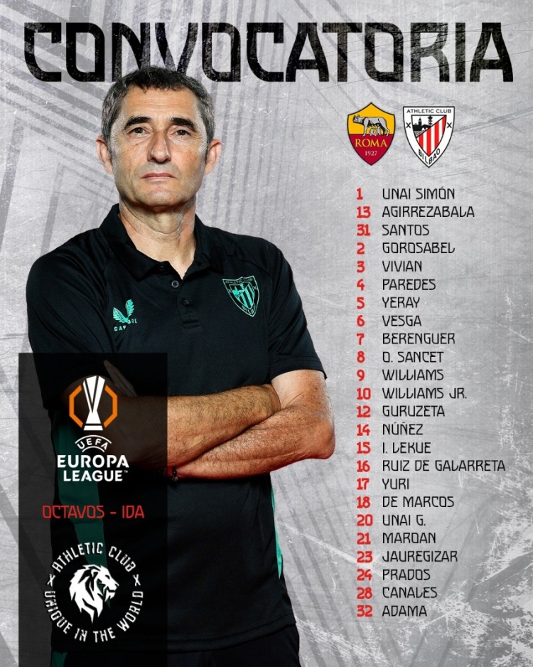3月4日訊 北京時間3月7日凌晨4:00,歐聯杯1/8決賽首回合,畢爾巴鄂競技將客戰羅馬。賽前,畢爾巴鄂競技官方公布了本場比賽球隊大名單。