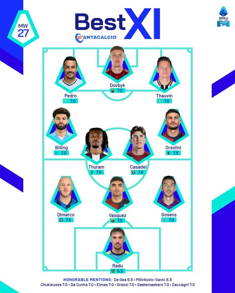 2025-03-05 01:45:02意甲本輪官方最佳陣:K-圖拉姆、迪馬爾科領銜,佩德羅在列