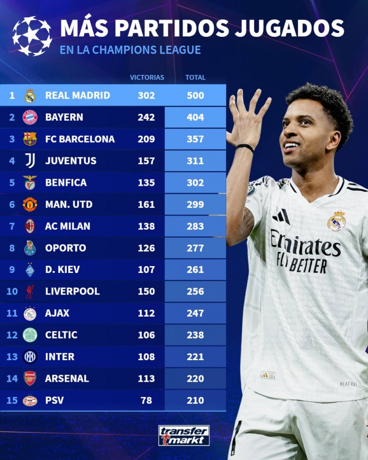 2025-03-06 00:09:53俱樂部歐冠參賽場次排行:皇馬500場居首,拜仁巴薩二三位