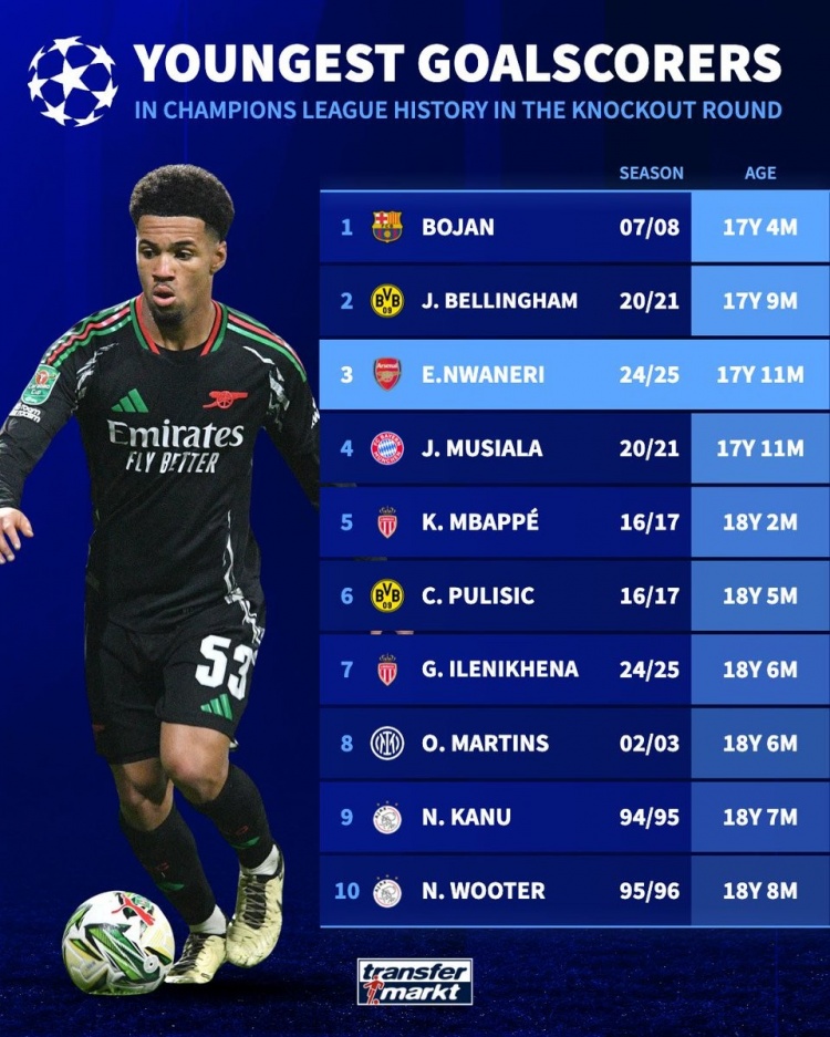 3月5日訊 阿森納在本輪歐冠淘汰賽客場7-1血洗埃因霍溫,小將恩瓦內里破門,數據統計顯示他也是歷史第3年輕達成歐冠淘汰賽進球的球員。