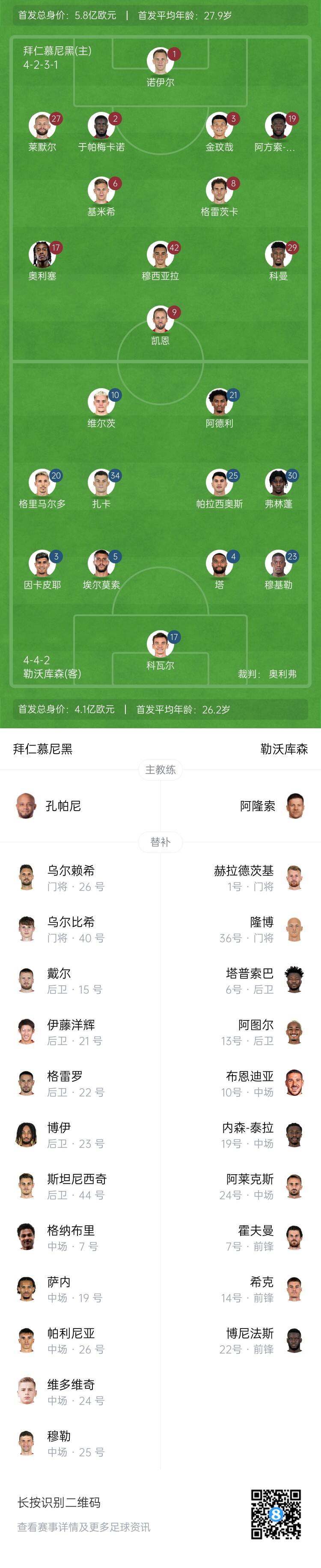 3月6日訊 歐冠1/8決賽首回合,拜仁主場對陣勒沃庫森。賽前,官方公布了本場的首發名單。