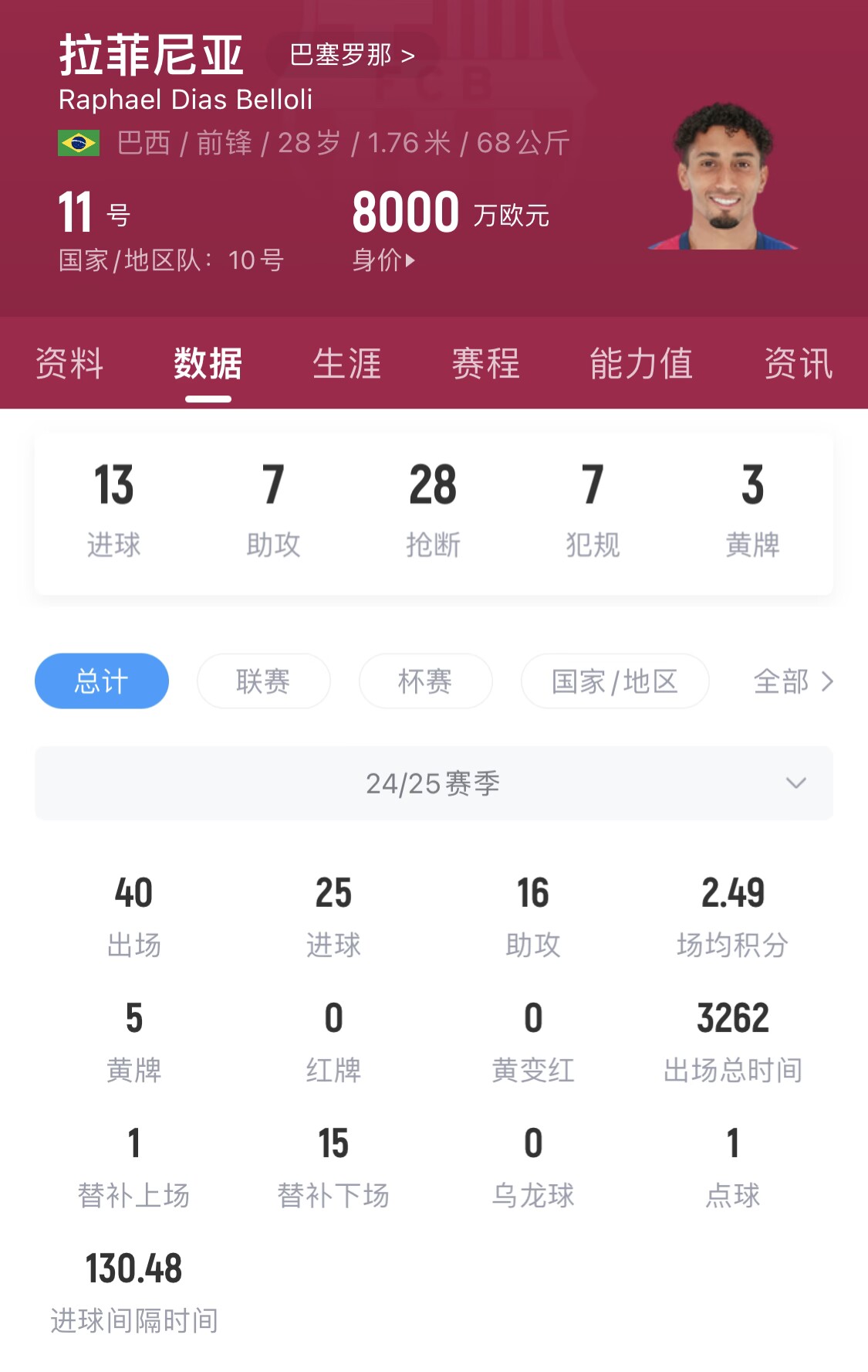 2025-03-06 13:04:24實打實的8000萬!拉菲尼亞25球16助,金球獎賠率第3高于維尼修斯