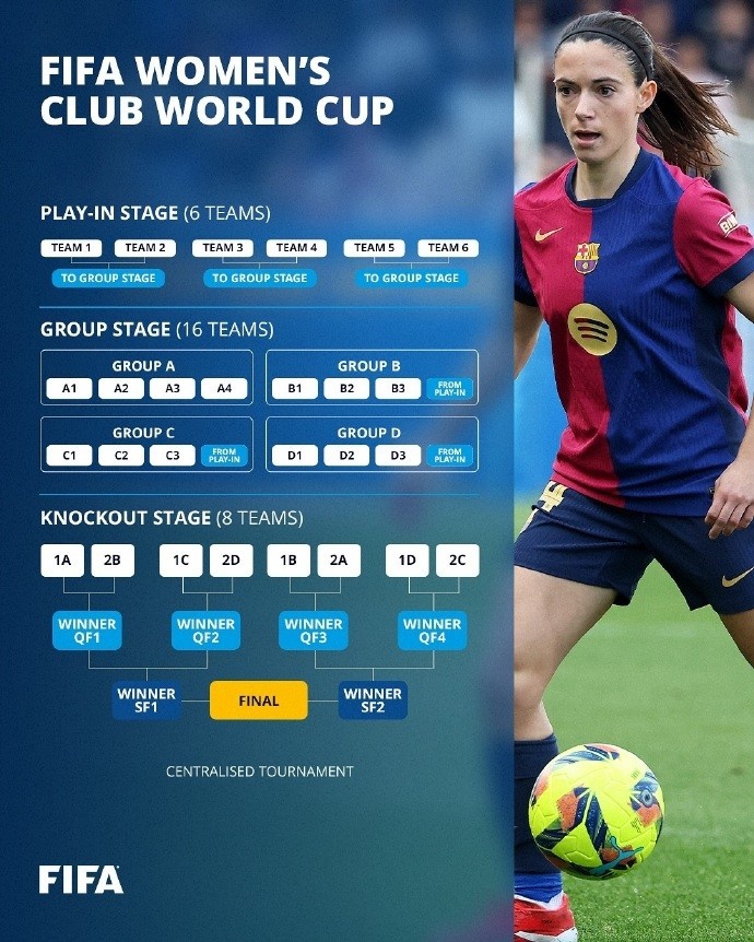 女足世俱杯具體的賽制方面,19個參賽名額分為13個小組賽名額以及6個分組資格賽名額,亞足聯、非洲足聯、中北美及加勒比海足聯和南美足聯各有兩個小組賽名額,歐足聯則有五個小組賽名額,分組資格賽名額則六大足聯各有1個。女足世俱杯分為三個階段,首先是分組資格賽階段(play-in),6支球隊分三組進行單回合淘汰賽,決出3個晉級小組賽的名額。隨后是16支球隊(13支小組賽球隊+3支分組資格賽勝者)組成的小組賽階段,16隊分為四組,每組前兩名球隊晉級淘汰賽。淘汰賽階段有8支球隊參加,采取單回合淘汰賽賽制。
