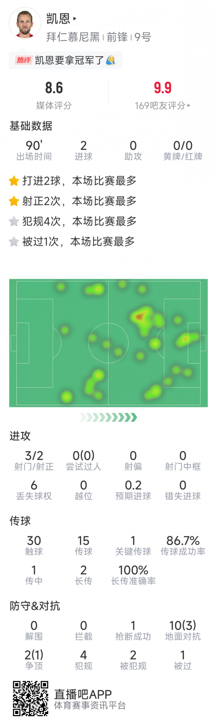 2025-03-06 13:15:50凱恩本場數據:梅開二度,3射2正,1次關鍵傳球,評分8.6分