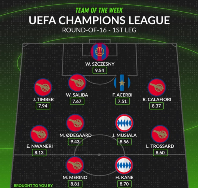 2025-03-06 19:11:53Whoscored評本輪歐冠最佳陣:厄德高領(lǐng)銜阿森納7人入選,凱恩在列