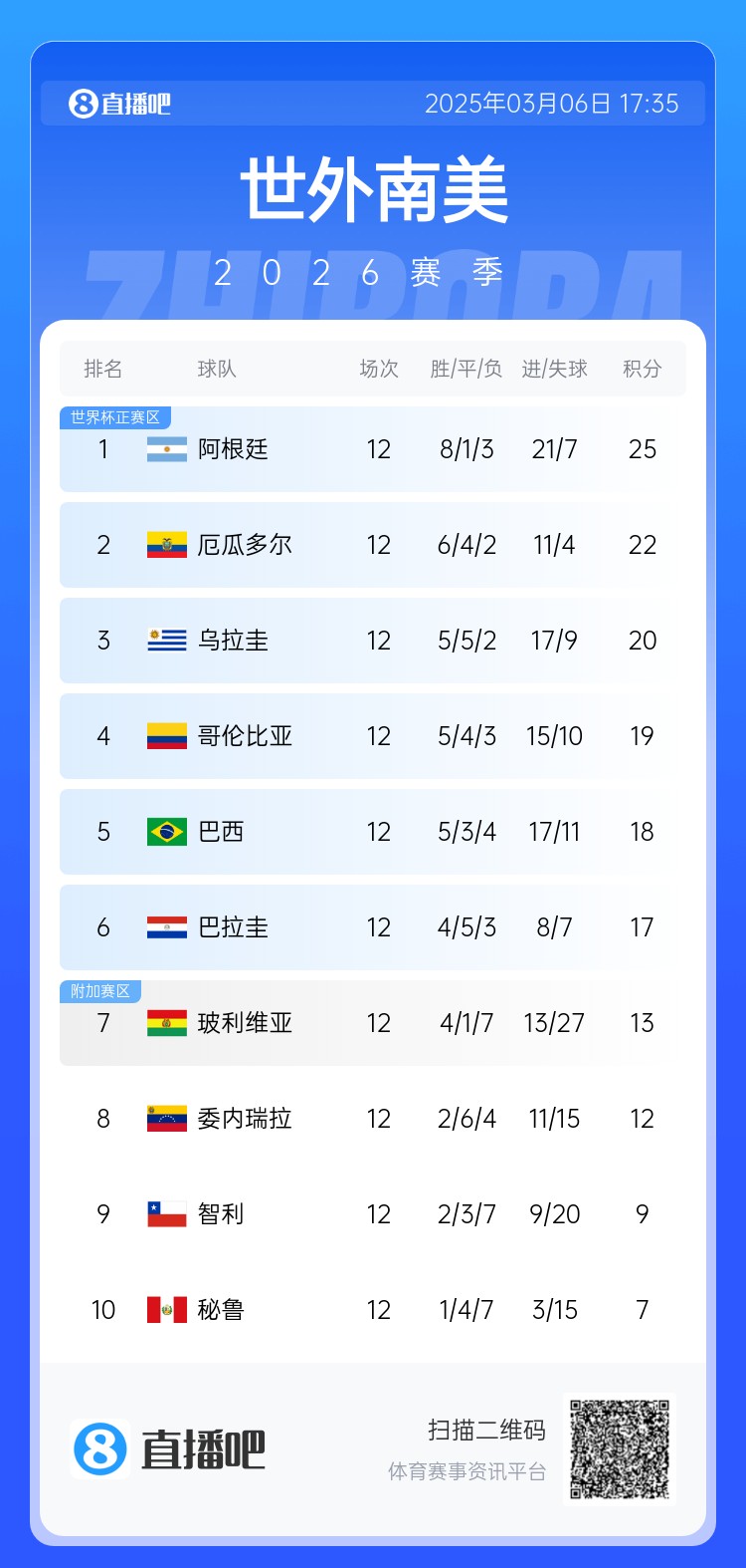 在3月份的世預賽中,巴西將先后交手哥倫比亞和阿根廷,目前巴西隊5勝3平4負積18分,位列第5。