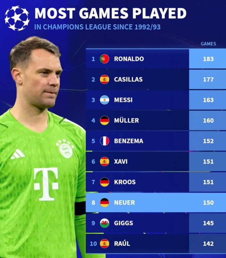 2025-03-06 22:40:55改制后歐冠出場榜:C羅183場、梅西163場,諾伊爾150場列第8
