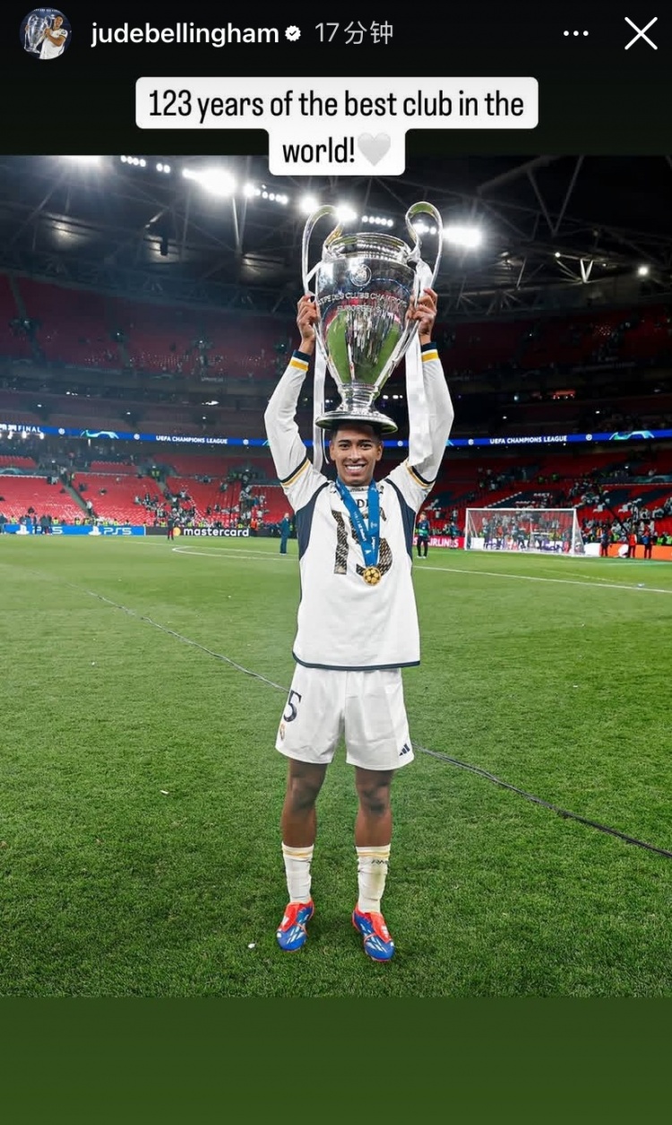 2025-03-07 01:30:22貝林曬高舉歐冠獎杯照片祝賀皇馬:世界上最好的球隊123歲了!