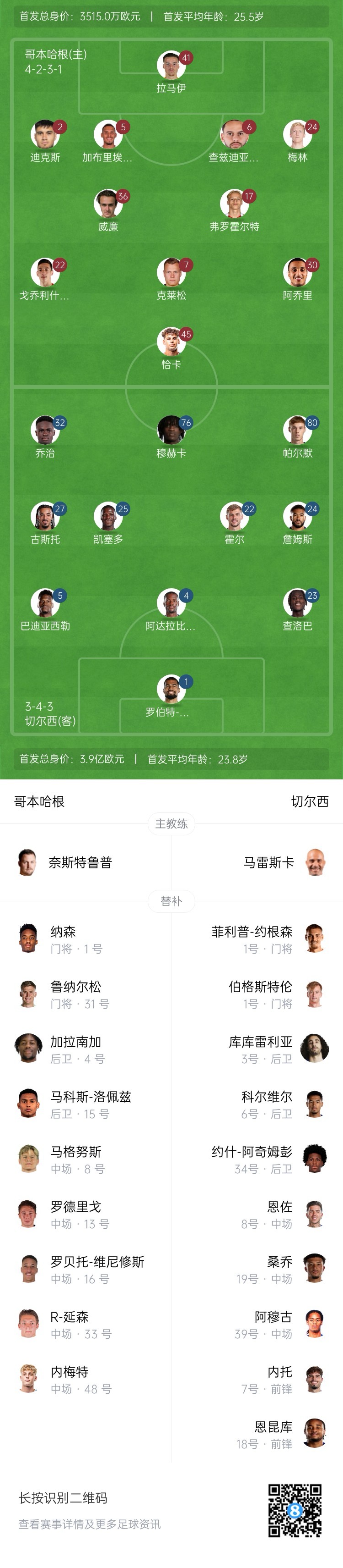 哥本哈根替補(bǔ):1-納森-特羅特、31-魯納爾松、4-穆納什、15-馬科斯-洛佩茲、8-馬格努斯、13-羅德里戈-休斯卡斯、16-羅貝托-維尼修斯、33-R-延森、48-內(nèi)梅特